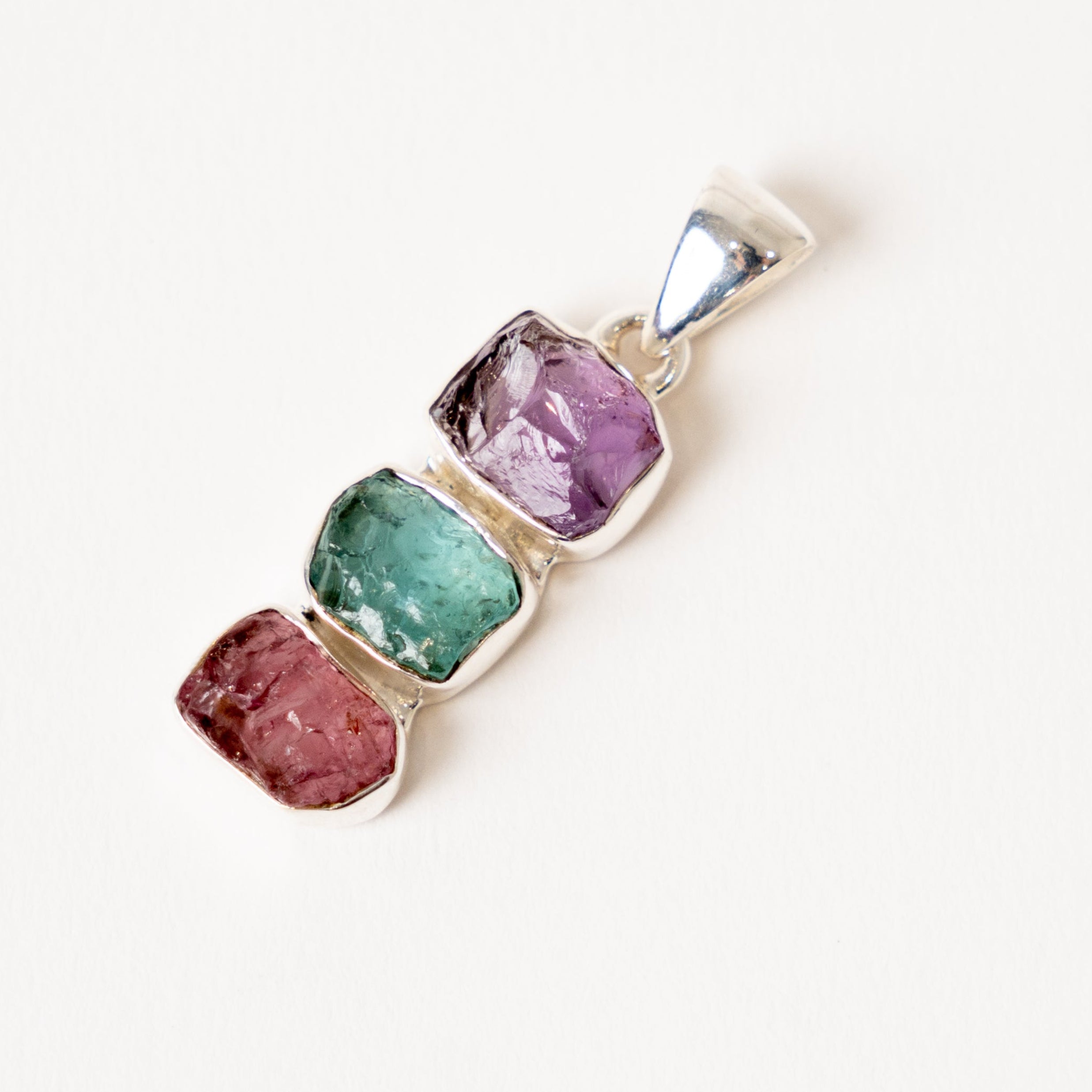 Elevate your spirit with our exquisite 3-stone Pendant featuring Amethyst, Blue Apatite, and Pink Tourmaline, lovingly handcrafted in India from 92.5 Sterling Silver. Each stone carries unique healing properties, making it a powerful talisman for self-discovery and empowerment.