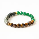 This stretchable bracelet is made with Green Jade, Yellow Tiger Eye and African Bloodstone, all semi-precious 8mm gemstone beads.