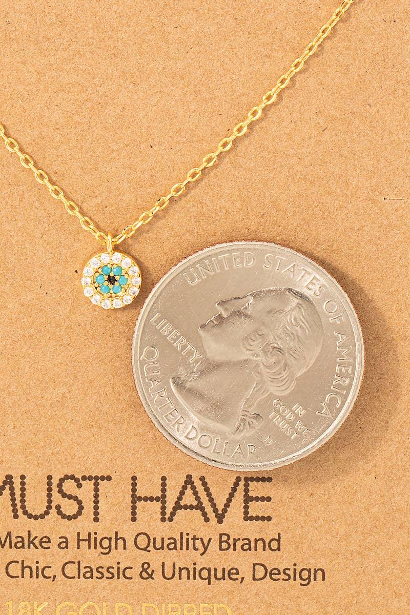 Discover the Rhinestone Trim Evil Eye Necklace from Fame Accessories, a stylish addition to any outfit. With an approximate length of 16 inches, this pendant charm necklace is designed to make a statement.