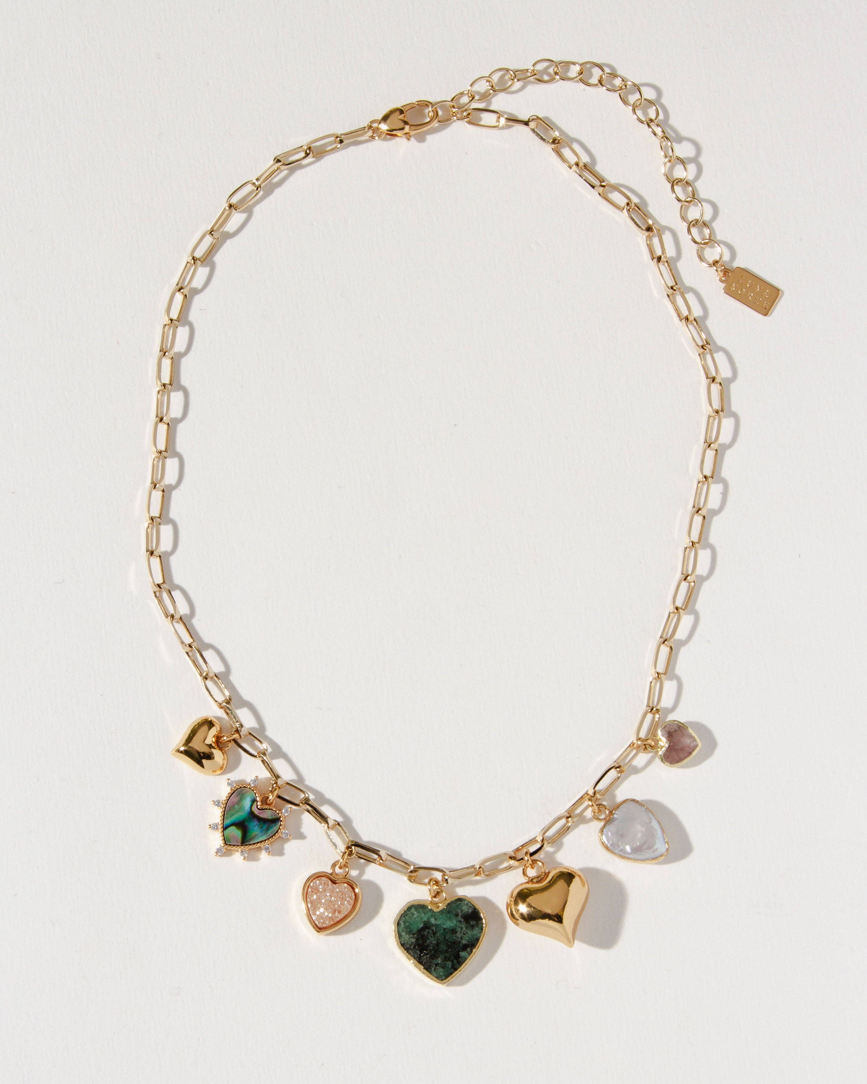 Feel the grounding power of connection with the Earth's Heartbeat Charm Necklace. This exquisite piece features seven beautifully crafted heart charms, each symbolizing love and harmony. Adorned with precious gems like peach druzy quartz and abalone shell, it radiates positive energy and fosters emotional balance.