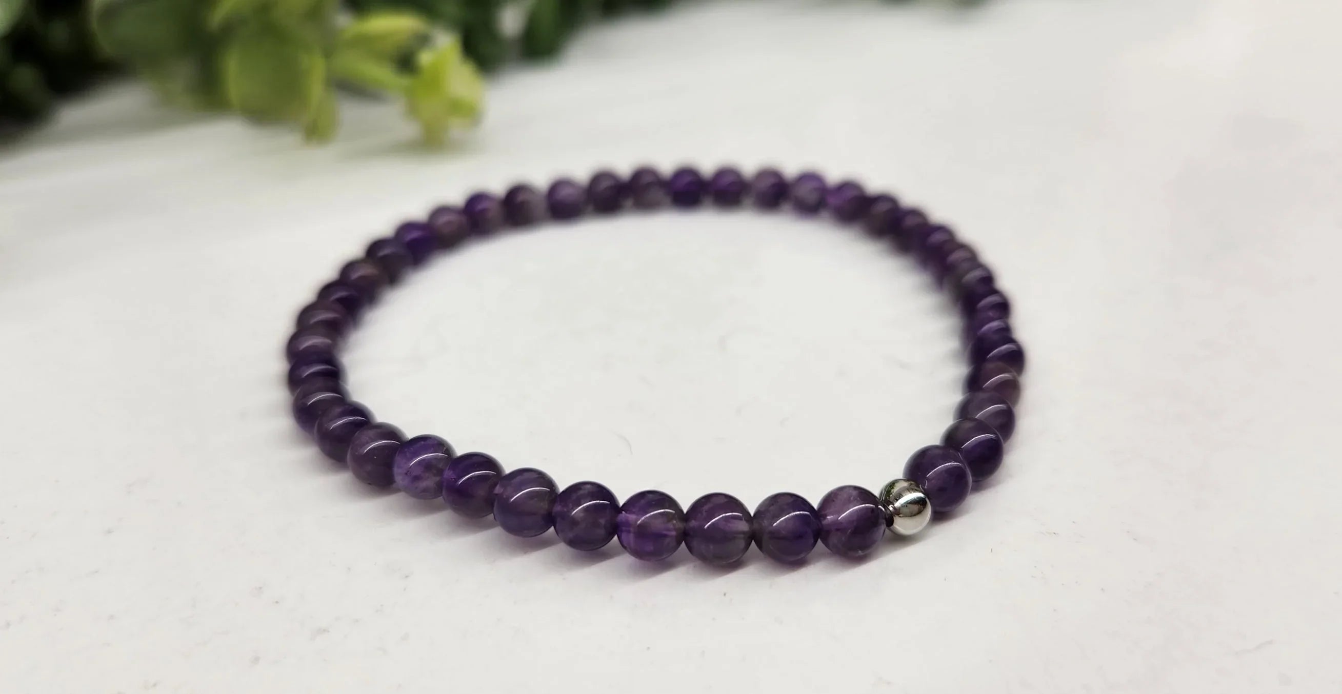 Amethyst Stretch Bead Bracelet For Serenity and Protection. Amethyst is believed to resonate with the crown chakra and clearing our connection to Spirit, empowering us to hear our higher wisdom. Amethyst is known to create a barrier of psychic protection and to create a peaceful vibration.