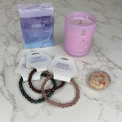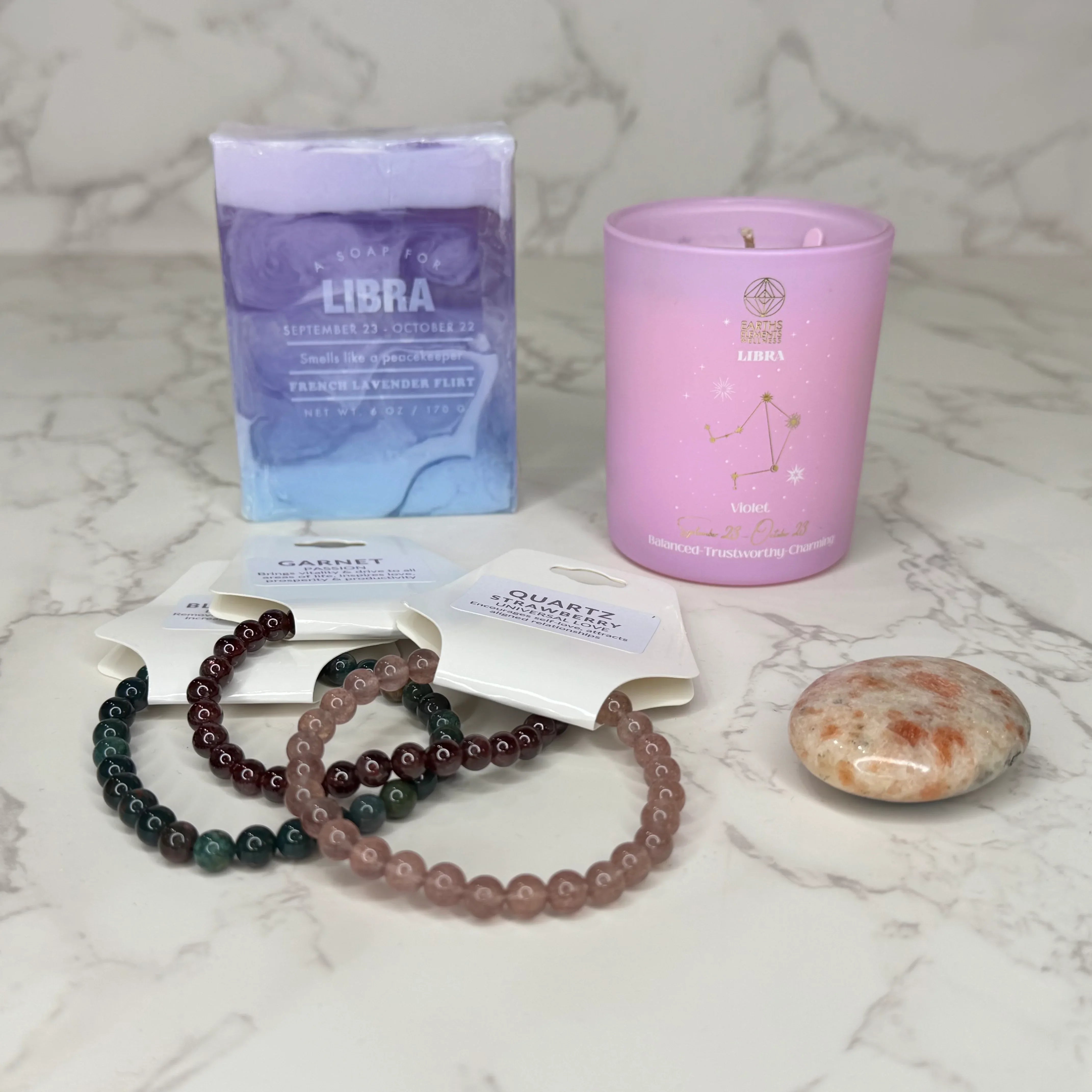 Featuring an invigorating Libra Candle, handcrafted zodiac soap, a Sunstone palm stone, and three empowering gemstone bracelets, this bundle offers the perfect balance of courage, focus, and self-discovery.