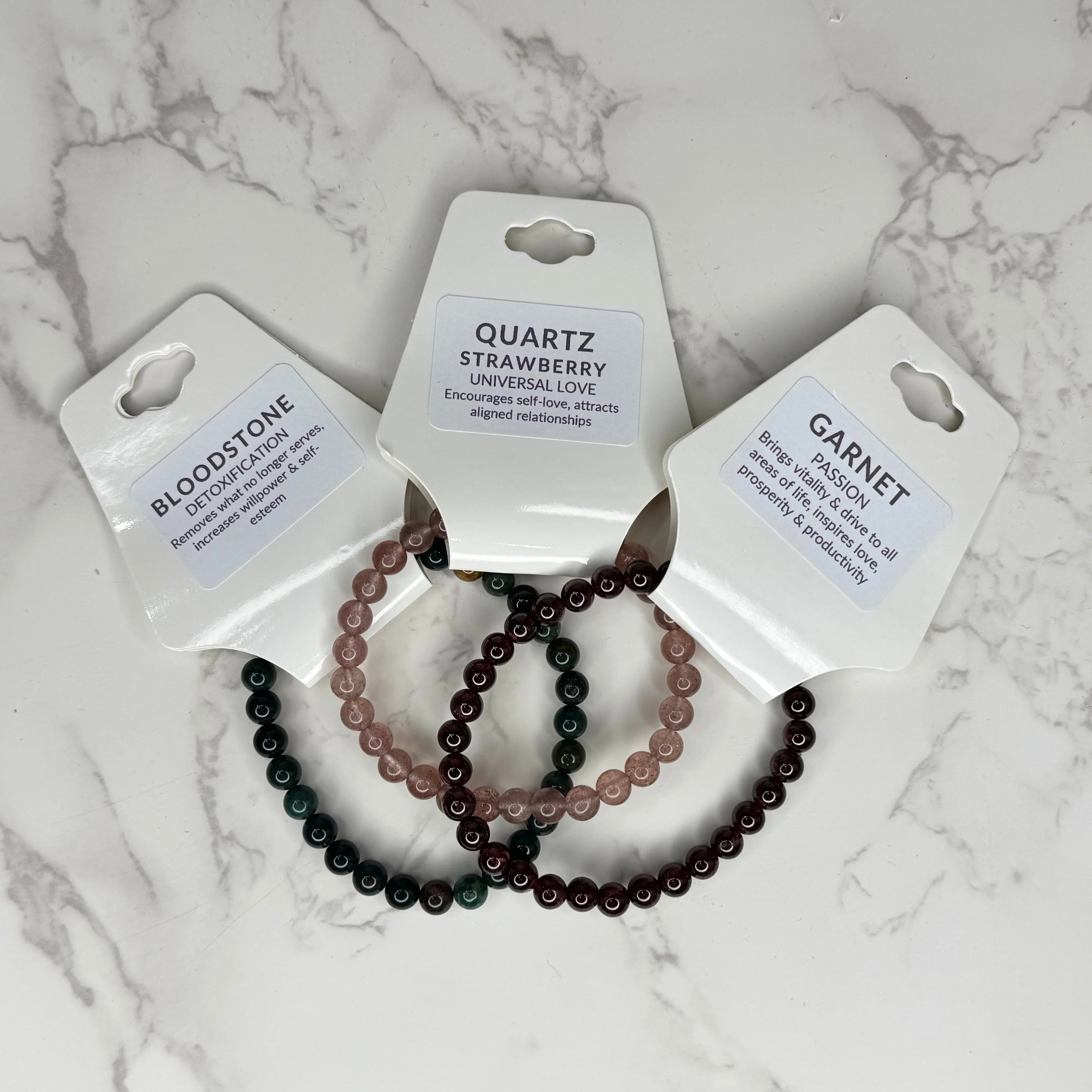 - Gemstone Bracelets: authentic Garnet, Strawberry Quartz, and Bloodstone