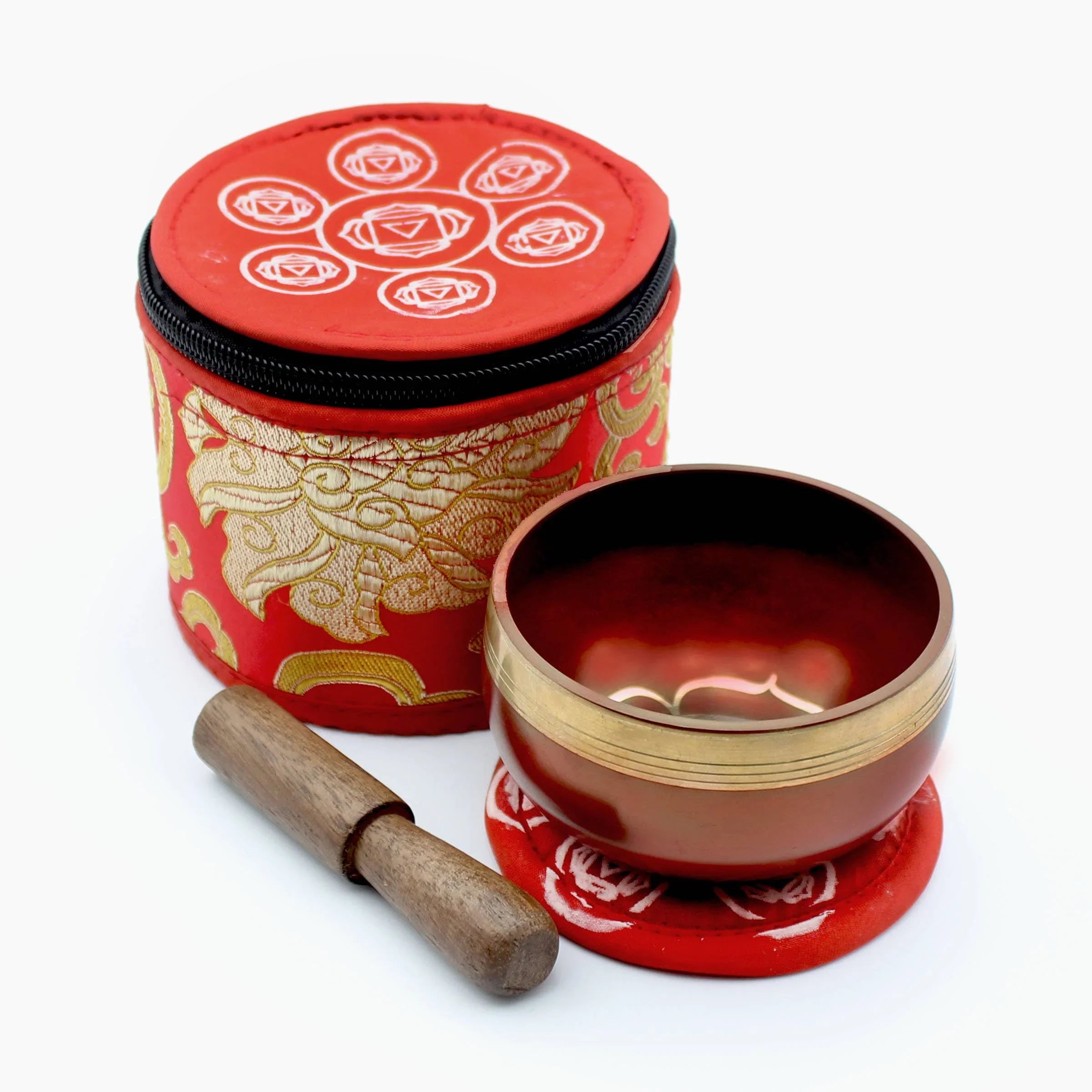 Red/Root Chakra Metal Singing Bowl in Silk Case Bowl measures 3" in diameter and 3" height. Handcrafted Silk Case is 4" in diameter and 3" height. Wooden Mallet measures 3.5" in length. Cushion is 3.25" in diameter. Handcrafted in Nepal.