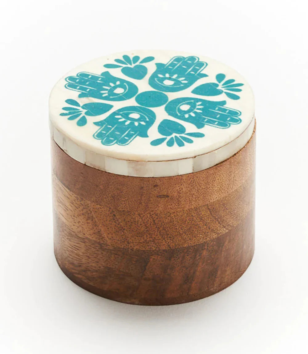 Master artisans in Old Delhi skillfully hand carve wood and bone elements to create unique, eye catching inlay designs. This handcrafted round keepsake box is thoughtfully designed for stylish safekeeping. The hand carved bone lid features a blooming Hamsa hand design. Lid lifts completely to reveal a cylindrical, open interior.