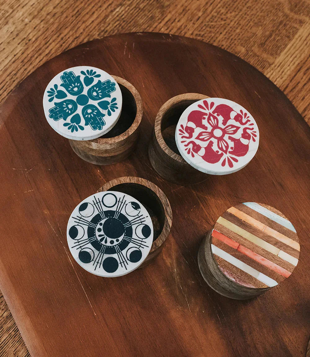 This handcrafted keepsake box incorporates traditional Indian art forms in modern designs, featuring sustainably harvested mango wood, ethically sourced bone, and hand detailed, flora and fauna inspired designs.