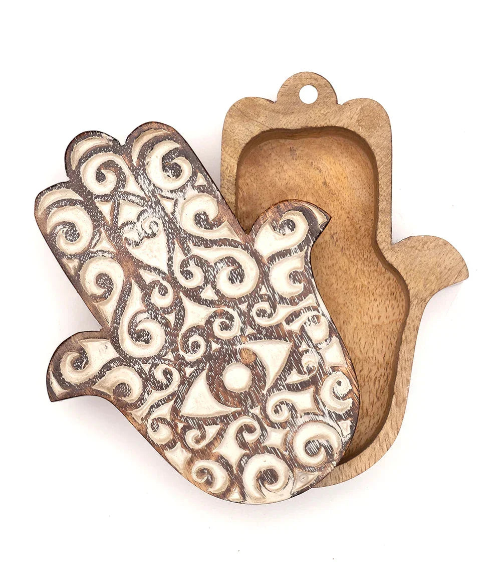 Handcrafted in North Central India, the hand engraved Hamsa design and white rub finish give the box the feel of an heirloom collected in the bustling spice markets of Delhi or Calcutta. Elevated shabby chic home decor to display in your own home or give as a gift to the antique lover in your life!