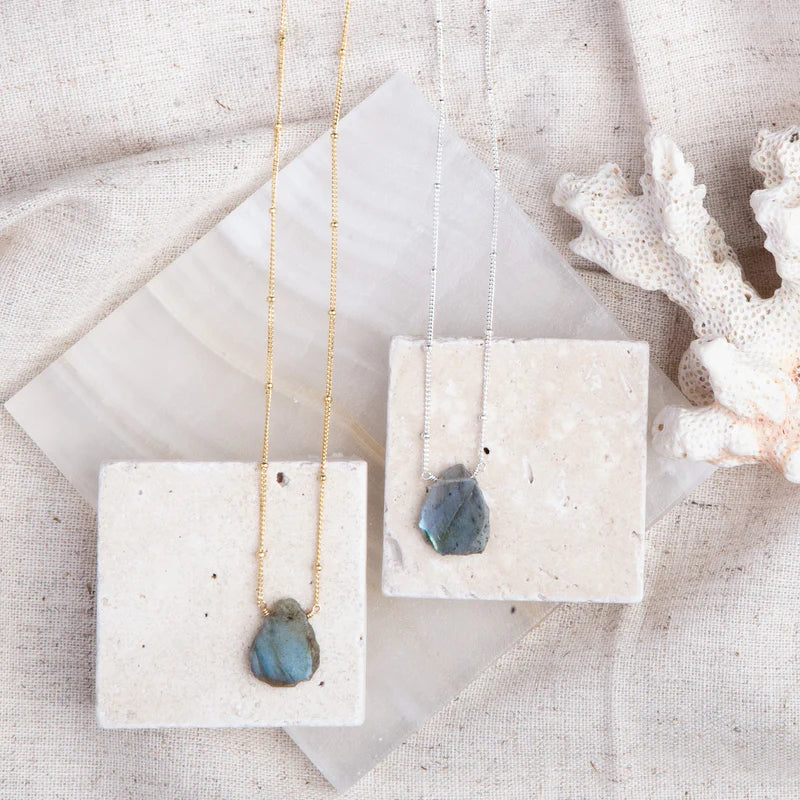 This beautiful Fiji Necklace features a stunning, rough cut Labradorite stone with a smooth finish that is mounted on delicate beaded curb chain. It makes the perfect layering piece and give a gorgeous pop of color to any outfit.