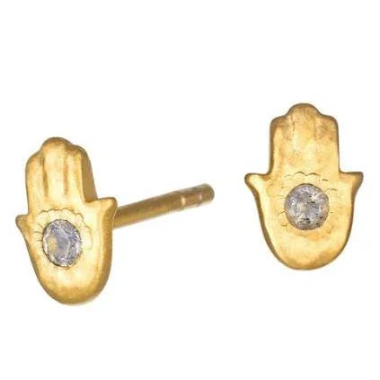 These delicate stud earrings in gleaming 18kt gold plate symbolize protection and abundant blessings; an accent of labradorite—stone of imagination, perseverance, and truth—creates sparkle and adds meaning.