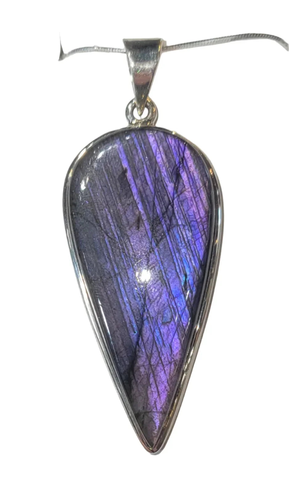 Labradorite Purple Flash Pendant Features Purple Labradorite, also known as Spectrolite, which is a rare and exquisite variety of labradorite, a feldspar mineral known for its iridescent play of colors.