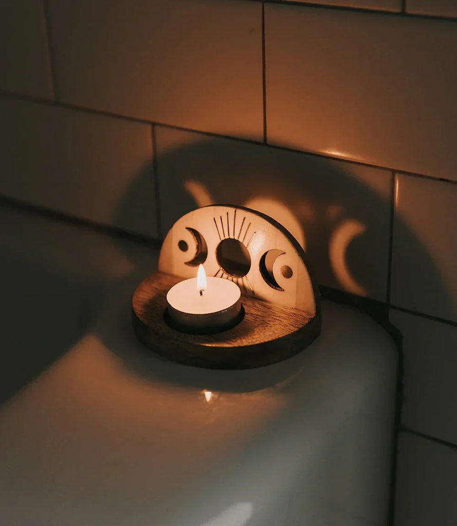 Elevate your space with this alluring, boho chic, lunar inspired tealight candle holder. This unique candle holder features a refined moon phase cutout design ethically handcrafted with sustainably harvested mango wood, ethically sourced bone, and shiny brass accents. This tealight holder features a shallow well in the mango wood base where the tealight can securely rest. Bring the light and celestial magic of the night sky to your space or a loved one with this intentionally designed piece.