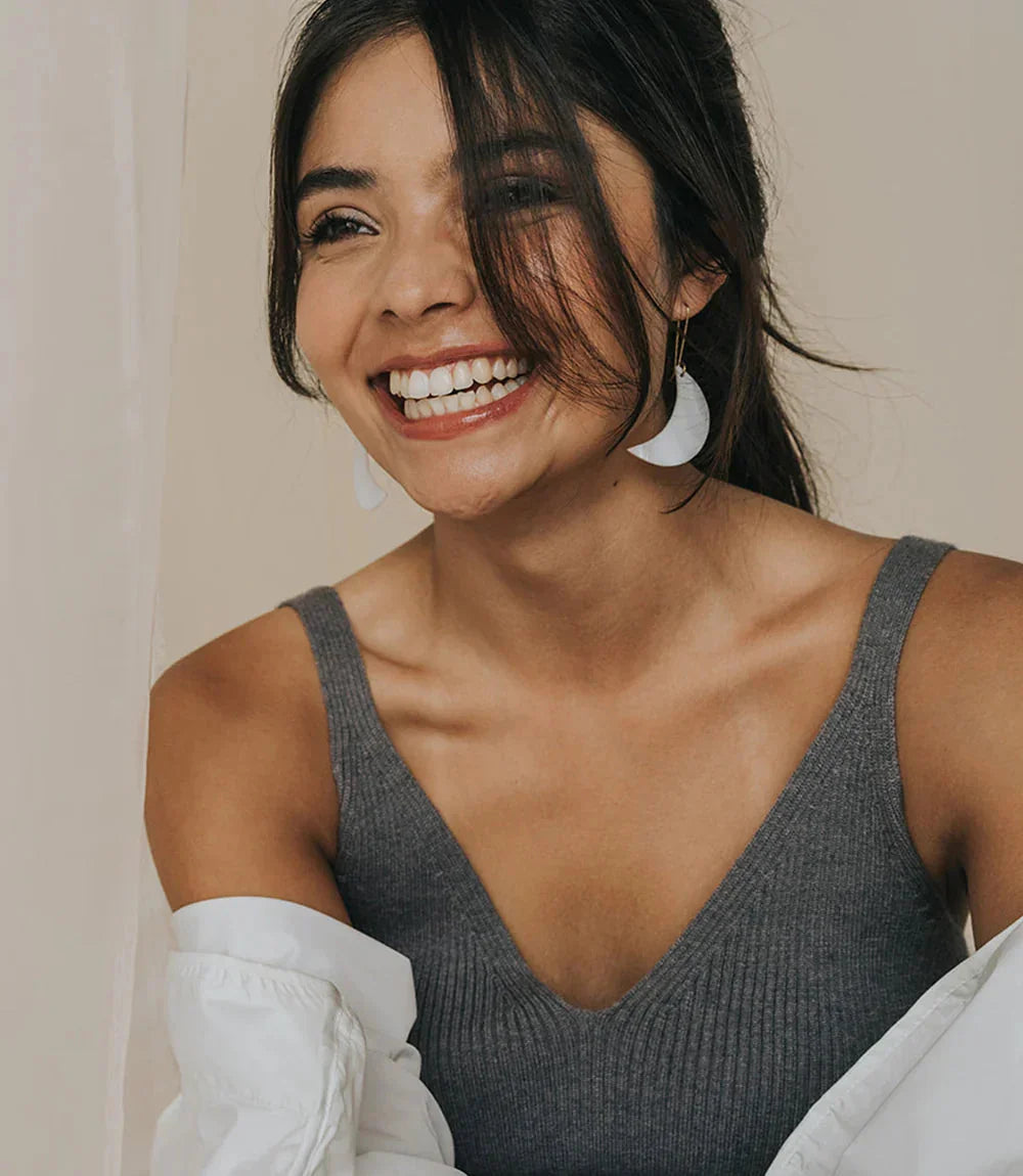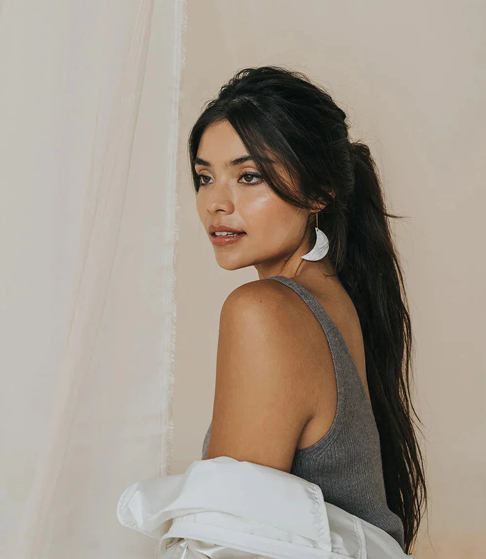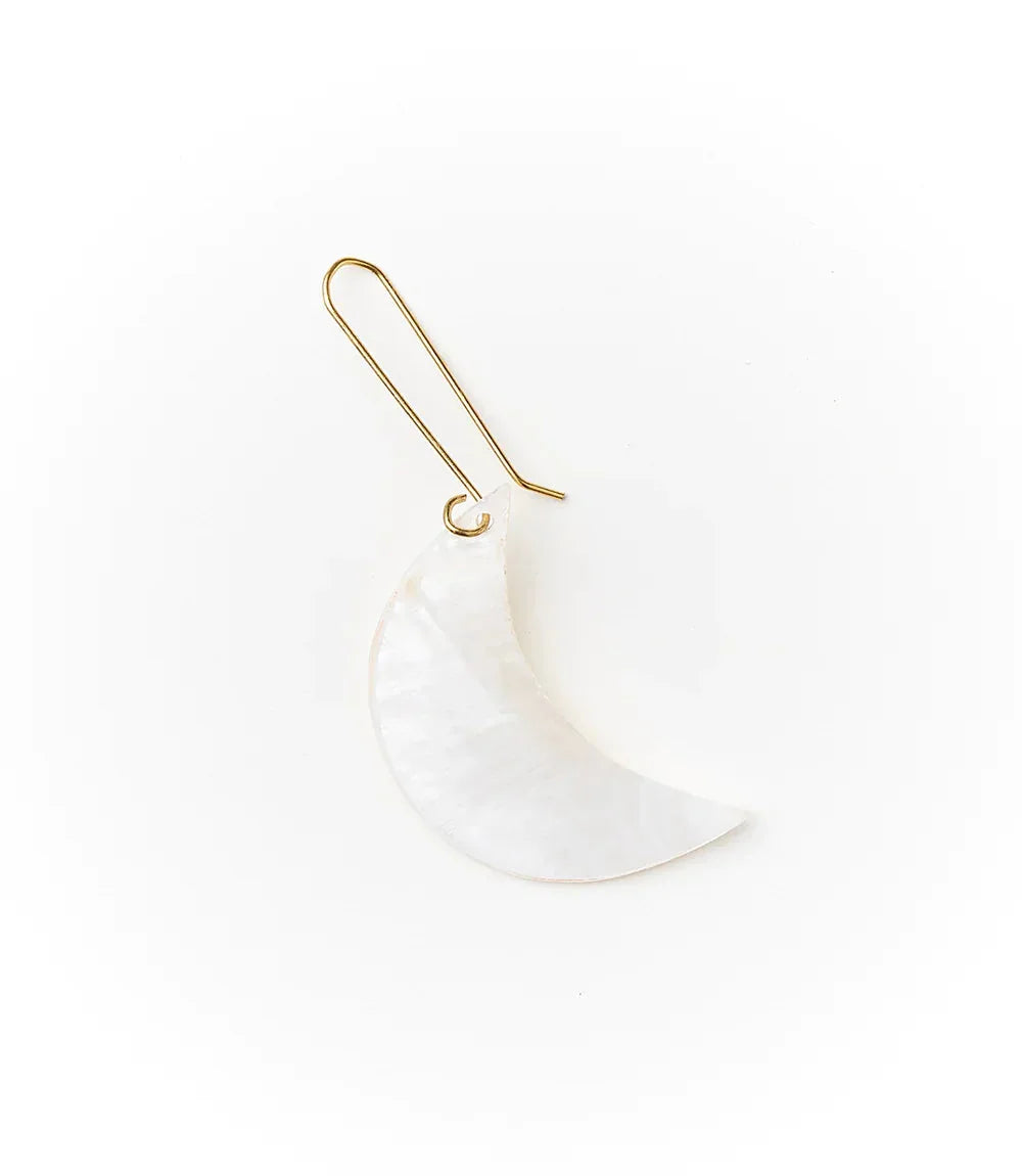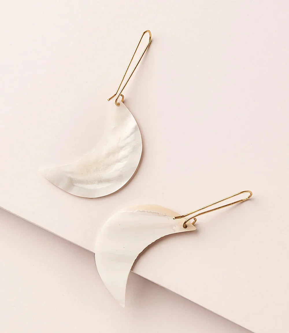 These lightweight, handcrafted drop earrings feature eye-catching, mother of pearl crescent moon charms and clean line, brass with gold finish setting.