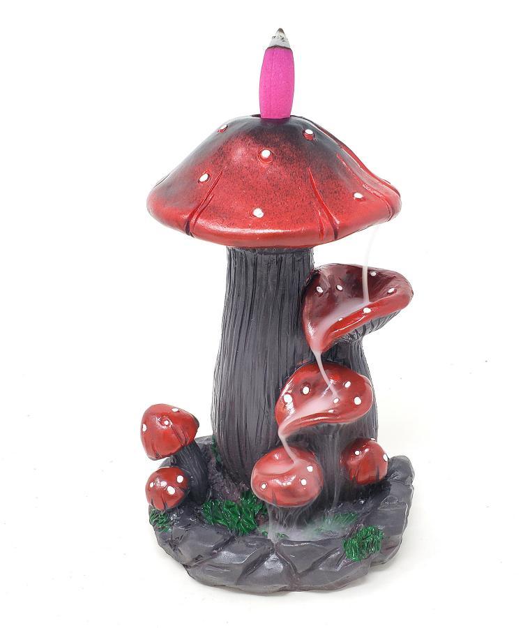 This whimsical ceramic incense burner features a mushroom garden. Designed for backflow incense cones or stick incense. The smoke will delicately curl down the bright red petals.