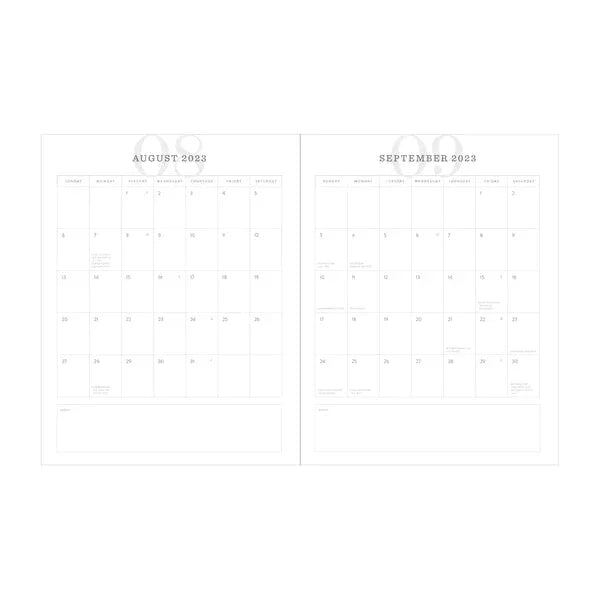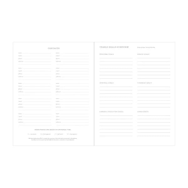 17-month dated planner with flexible cover wrapped in bookcloth, featuring original artwork with metallic gold foil design and lay-flat binding. Includes monthly grid spreads, weekly planning pages, to-do lists, a section for notes, and dual ribbon bookmarkers.
