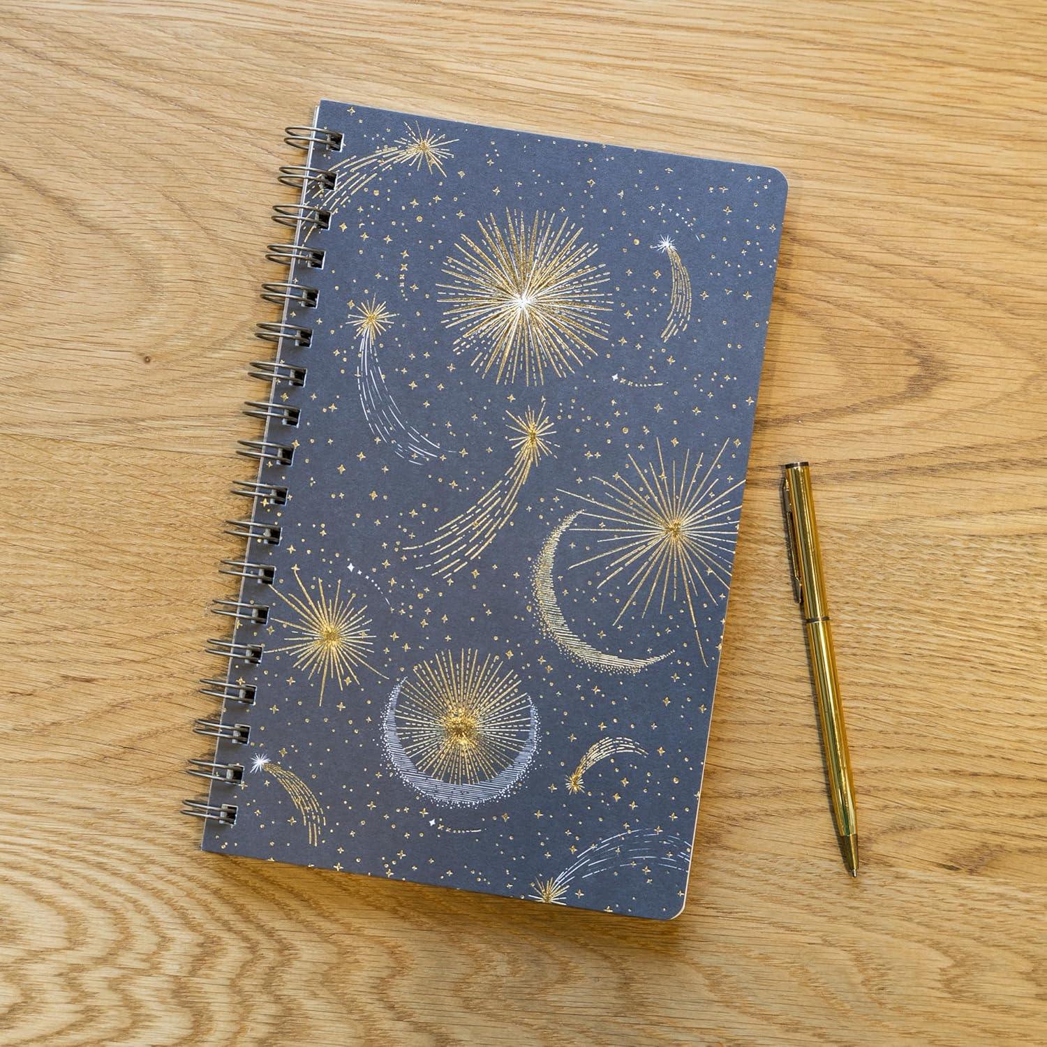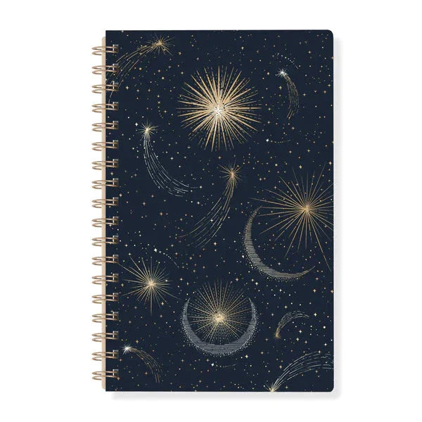 Signature spiral journal with flexible paper cover featuring original artwork, metallic gold foil design, and twin-ring spiral binding.