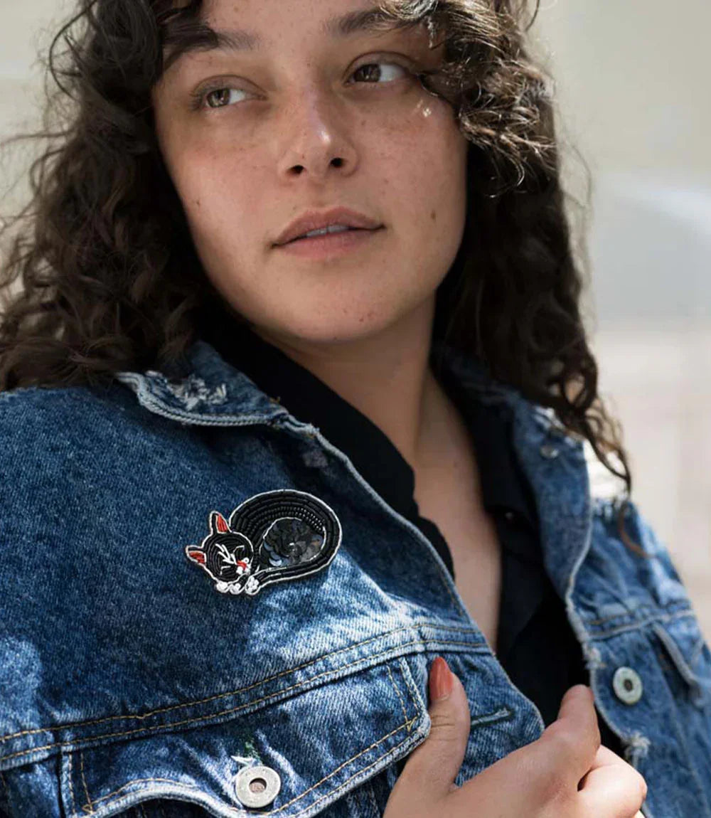 A small handcrafted accessory featuring a sleeping tuxedo cat motif made with glass beads and sequins. A secure metal pin and fabric backing make it easy to wear on bags, jackets, or hats.