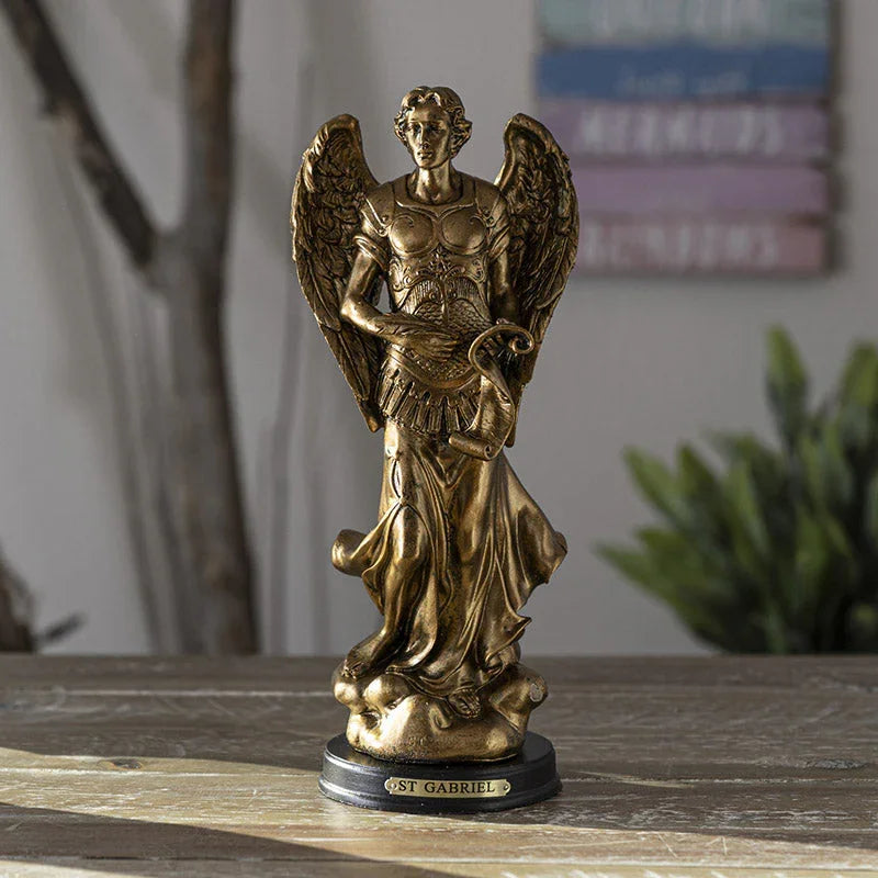 This bronze-colored cast statue features the archangel St. Gabriel. Archangel Gabriel is the messenger angel, hand helps one convey their truth, to find motivation and confidence, and to overcome issues of fear and procrastination.