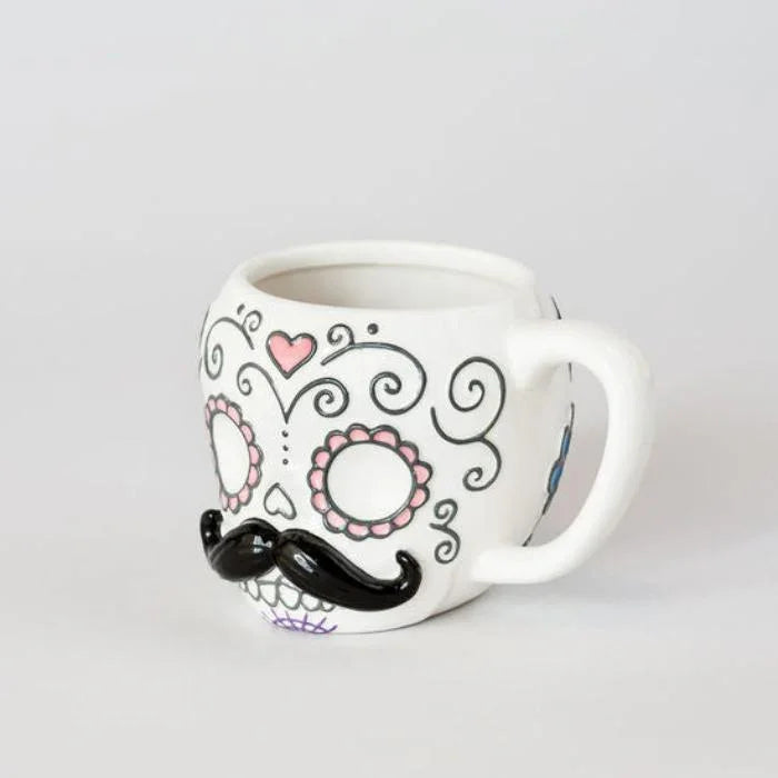 Elevate your morning coffee routine with our Sugar Skull Ceramic Mug. Sporting a charming moustache, this unique mug features a playful design that will make you smile every time you use it. Start your day off right with this fun and functional mug.