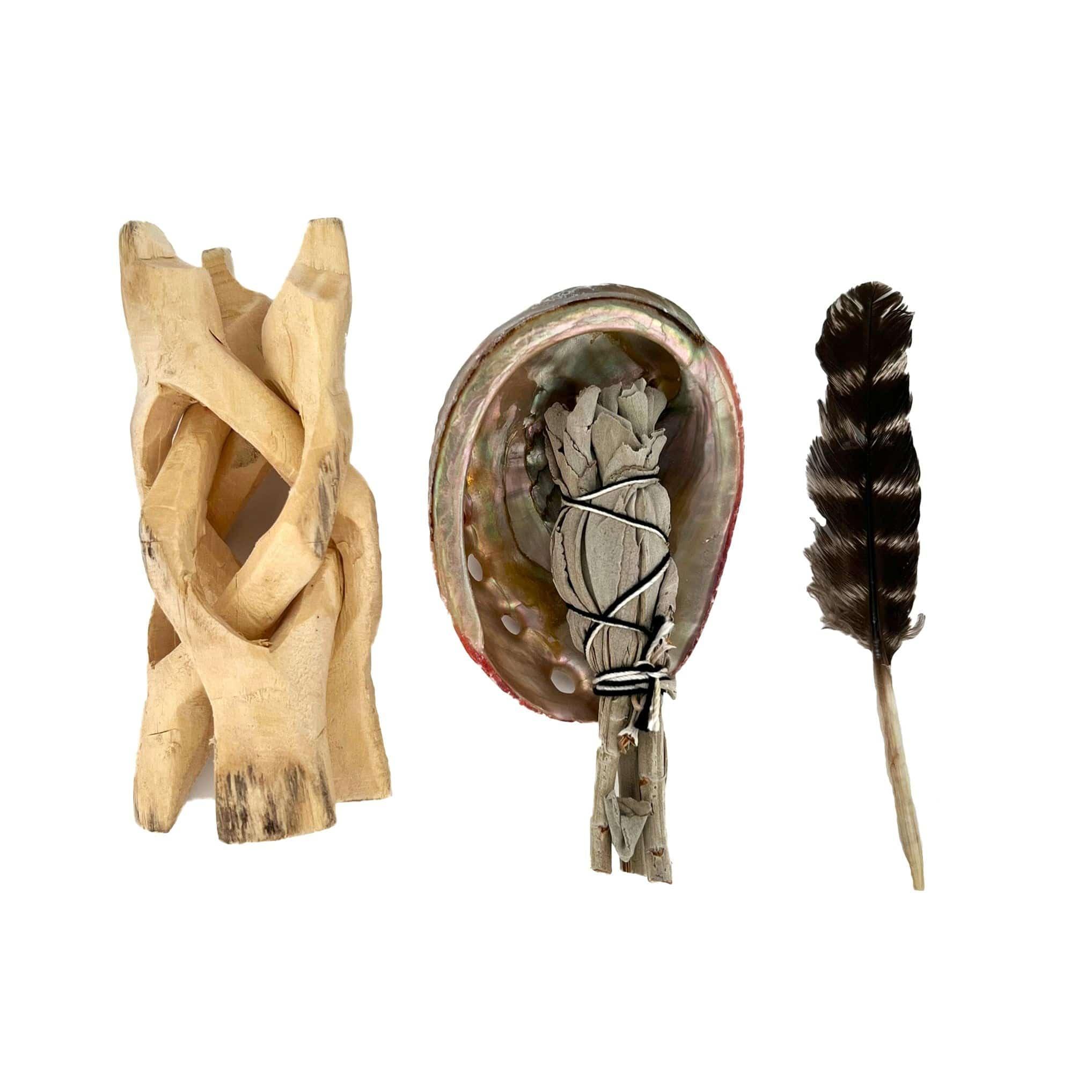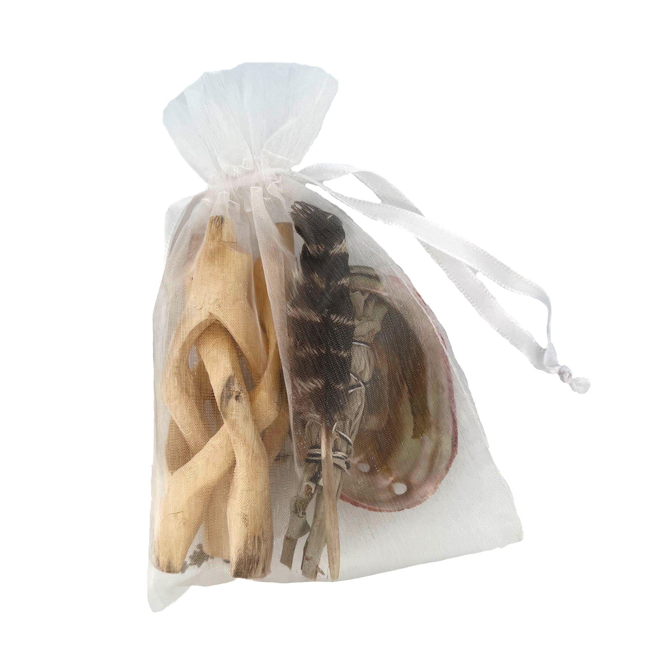 Includes one four-inch white sage smudge wand, one mini abalone shell, one feather, and one wood stand all in an easy-to-carry organza bag.